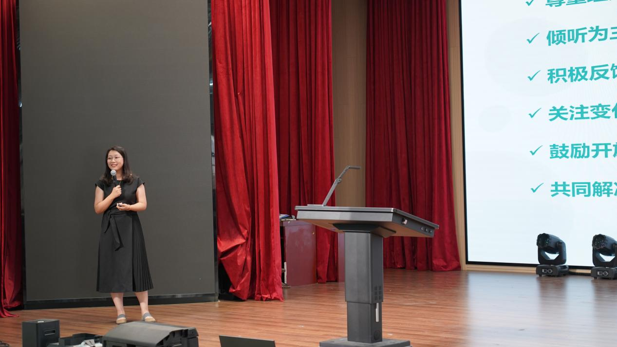随后,于路心以“理解自己、理解孩子、亲子沟通与家校合作”为主题展开宣讲。在“理解自己”部分,提出“改变认知、自我关照、营造氛围、专业介入”四项应对建议,鼓励家长合理调整生活重心,在关注孩子成长的同时实现自我提升,呼吁家长“同心共育,守护心灵”,学会做“会放风筝的人”。
