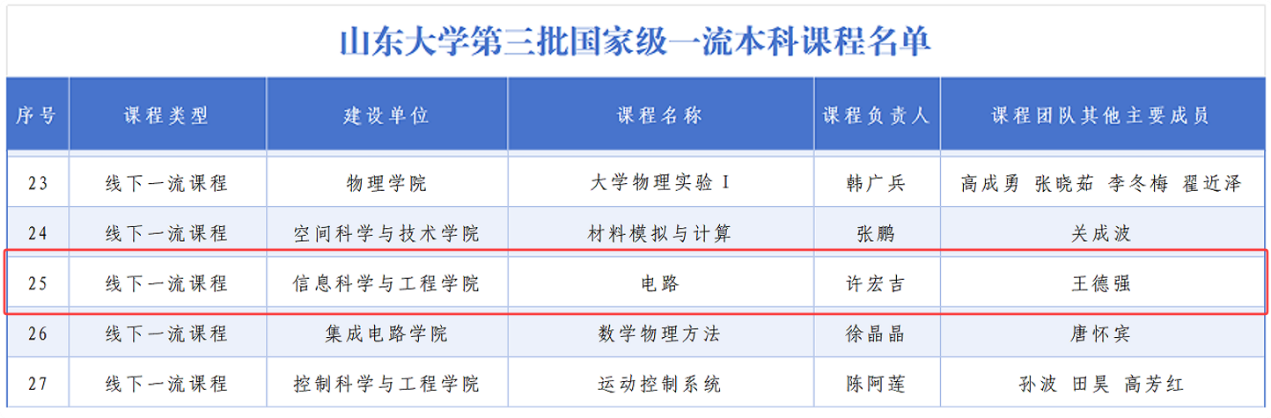 近期,教育部发布《教育部关于公布第三批国家级一流本科课程》(教高函〔2025〕9号),由许宏吉、王德强老师申报的“电路”课程成功入选,实现了我院在国家级一流本科课程建设领域零的突破。