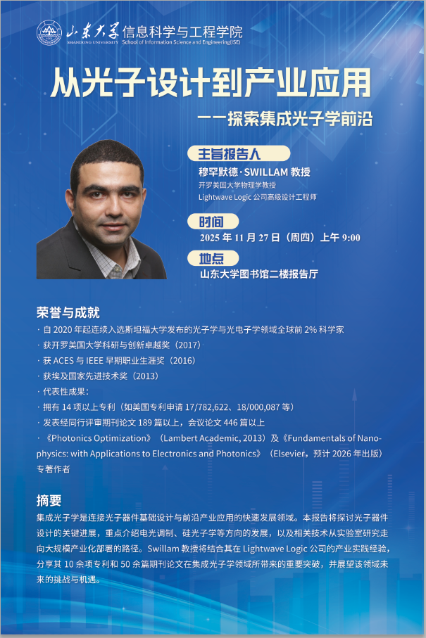 SWILLAM教授于2009 年在加拿大麦克马斯特大学获得电气与计算机工程博士学位,现任开罗美国大学理学院物理系教授兼系主任,曾担任该校纳米技术项目主任,并在美国 ASML 公司担任光学传感与计量方向的首席光学研究工程师,先后在耶鲁大学、纽约州立大学布法罗分校、多伦多大学等高校担任访问教授。Swillam 教授的研究主要集中于光子与纳米光子器件的设计、建模、制备与表征,重点应用于光学传感、硅光子学、等离子体纳米天线、新型太阳能电池、光学计量以及微波和太赫兹成像等领域;迄今为止,他在国际权威期刊和学术会议上发表论文 400 余篇,并拥有多项相关发明专利,其科研成果多次获得重要奖项,包括埃及国家先进技术奖、开罗美国大学科研与创新卓越奖等,并连续入选斯坦福大学发布的光子学与光电子学领域全球前 2% 高被引科学家榜单。同时,他在Journal of Optics(IoP)等多份期刊担任编委,曾任《Journal of Nanophotonics》《Frontiers in Physics》《Frontiers in Photonics》《Advanced Electromagnetics》等期刊的副主编或客座编辑,多次在国际重要学术会议上担任专题主席和组织者。